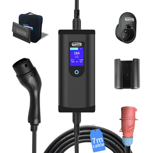 Andalung Bärbar EV Laddare Typ 2 11kW, 3-fas, 6-16A, 7m Kabel med Justerbar Ström, Röd CEE Kontakt, IP65 Skydd, Utan App, Kompatibel med Alla PHEV/EV Fordon