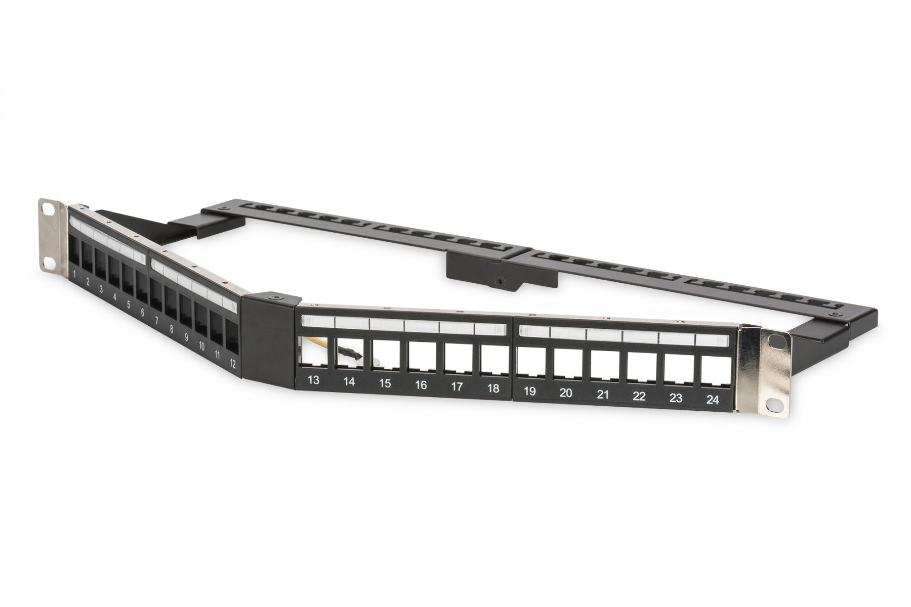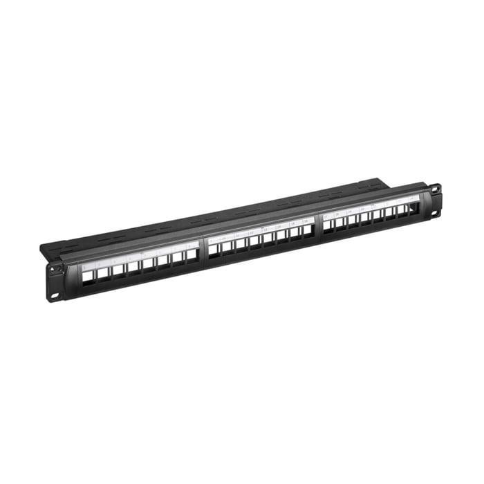 19" vinklad patchpanel 24x keystone, skärmad, 1U, svart, kabelhantering, etikettfält