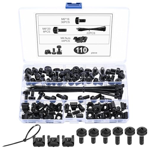 110 ST M6 Burmuttrar 19 Tum Rack, Burmuttrar Skruvsats för 10 Tum 19 Tums Nätverksskåp Strömlist Serverhölje Rackskruvar, inkl. 22 Buntband (svart)