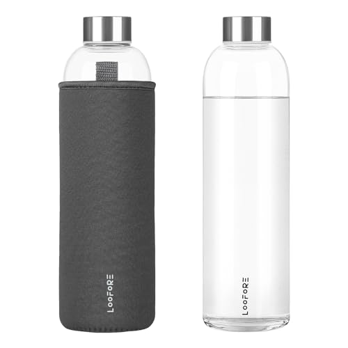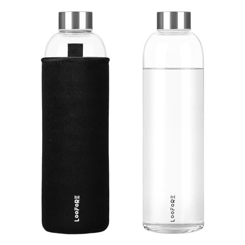 LOOFORE 1 l Glasflaska, 1000 ml Vattenflaska Glas, BPA-fri, Läckagesäker, Ateranvändbar Borosilikatflaska, Glasvattenflaska för Kontor, Sport, Camping, Barn och Vuxna