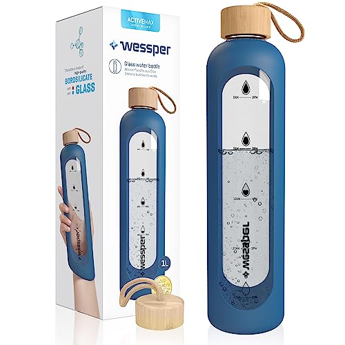 WESSPER Termosflaska glas 1 l med tidsmarkeringar, BPA-fri drickmotivation, borosilikat, vattenflaska, lufttät glasflaska med bambulock, återanvändbar med silikonfodral – blå