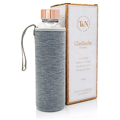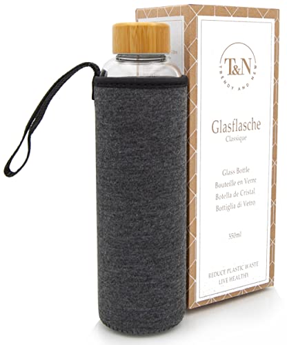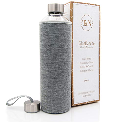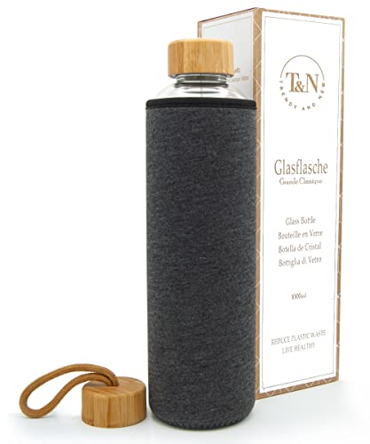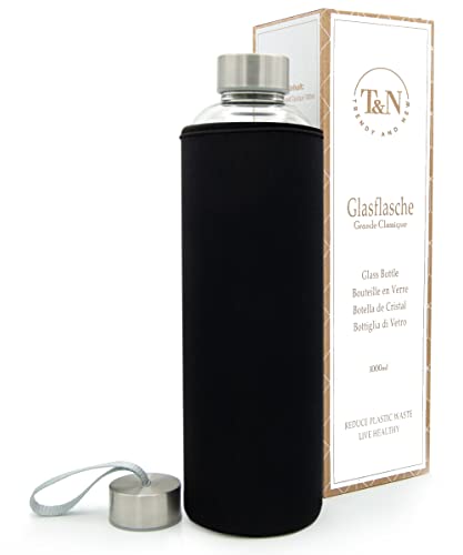 T&N Glasflaska, 1 liter – drickflaska glas 1 l med neoprenfodral, vattenflaska 1 000 ml, läckagesäker – glasflaska av tjockt borosilikatglas – smal design