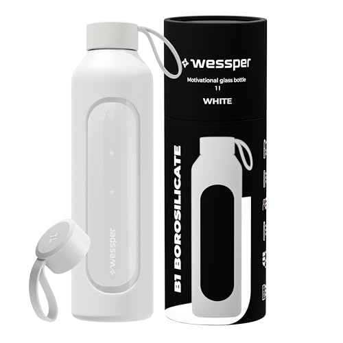 Wessper Termosflaska glas 1 l med tidsmarkeringar, BPA-fri drickmotivation, borosilikat, vattenflaska, lufttät glasflaska med bambulock, återanvändbar med silikonfodral – vit