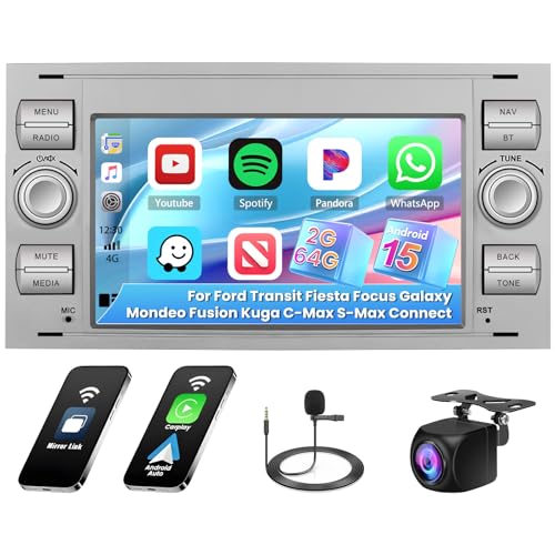 2G 64G Trådlös CarPlay Bilradio för Ford Fiesta Focus Transit Mondeo Kuga C-Max S-Max 7'' 2 Din Android13 Skärmradio med GPS Android Auto Bluetooth WIFI RDS FM MIC Bakre kamera (vit)