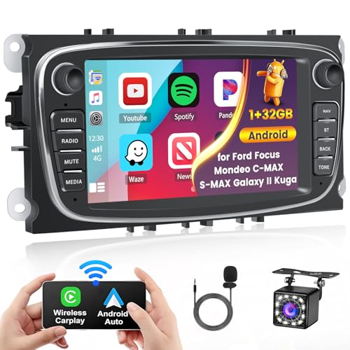 YUNTX Android 14 2 Din Radio Navigation för Ford Mondeo/S-max/C-max/Focus/Galaxy: [Integrerad CarPlay/Android Auto/GPS] -IPS 2.5D 7 Tum Pekskärm-DAB/Bluetooth 5.0/Ratt Kontroll/Mirror-Link/Camera