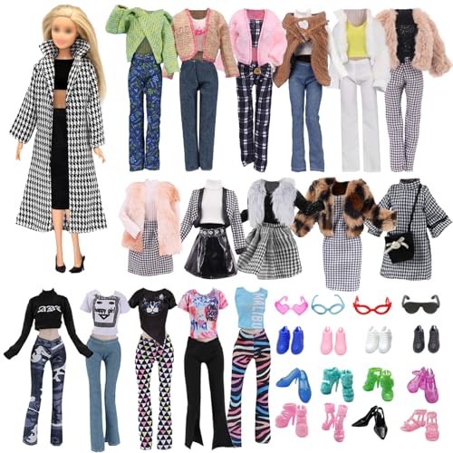 30 kläder dockor, 1 tusen rutig fågelkappa 2 vinterrockar 4 toppar 1 tröja 2 kjolar 3 byxor 1 hatt 2 glasögon 4 sneakers 10 höga klackar, för 11,5 tum flickdockor slumpmässigt