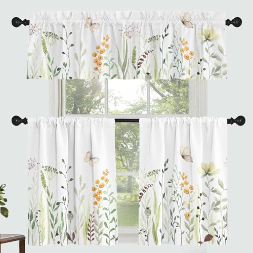 Fereyis Floral Leaves Curtain for Kitchen Bathroom Watercolour Yellow Flower Rod Pocket Window Tier Curtains Valance Set 3 Pcs Plant Printed Curtains 54 x 18 inches + 27 x 36 inches *2