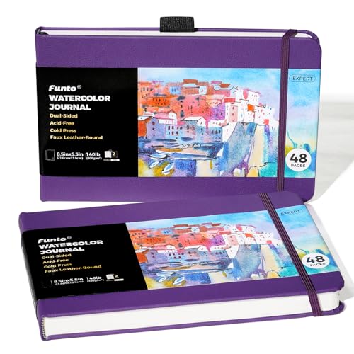 Funto Watercolor Journal, 8.5 x 5.5 inches, 2 Packs, 48 Pages Each, Purple Leather Cover, Cold Kaftan, Paper Bag, Mixed Media Art Supplies