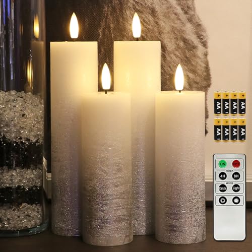 Fanna 4 flamlösa LED-ljus i silver med texturerad vaxfinish, realistiska hushållsljus med varmvitt ljus, batterier och fjärrkontroll ingår - Dia.2 inches