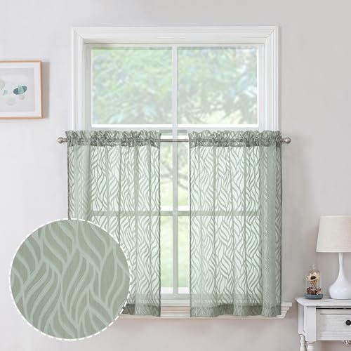 Chyhomenyc Marilyn Sage Green Sheer Curtains 36 Inch Length, Light Filtering Soft Airy 3D Leaf Clip Jacquard Textured Short Sheer Curtains for Bedroom Bathroom Small Windows, 38Wx36L Inches, 2 Panels