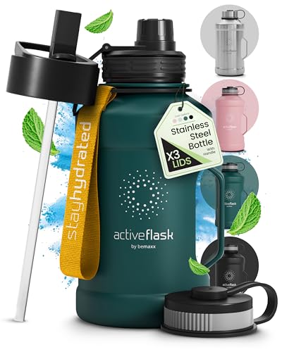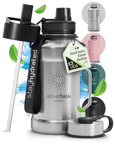 Dricksflaska Rostfritt Stål ACTIVE FLASK + Sugrör (3 Lock) | Stor 1,3/2,2 Liter Sportflaska BPA-Fri Läckagesäker Kolsyrad, 2l XL Vattenflaska Sport Utomhus Kondition
