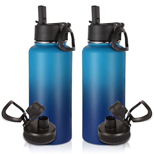 Volhoply 1 liter vattenflaska i rostfritt stål, två paket, vakuumisoleradflaska med sugrör, 1 l metall BPA-fri för barn, sport, skola (grön-blå färggradient, 2 i set)