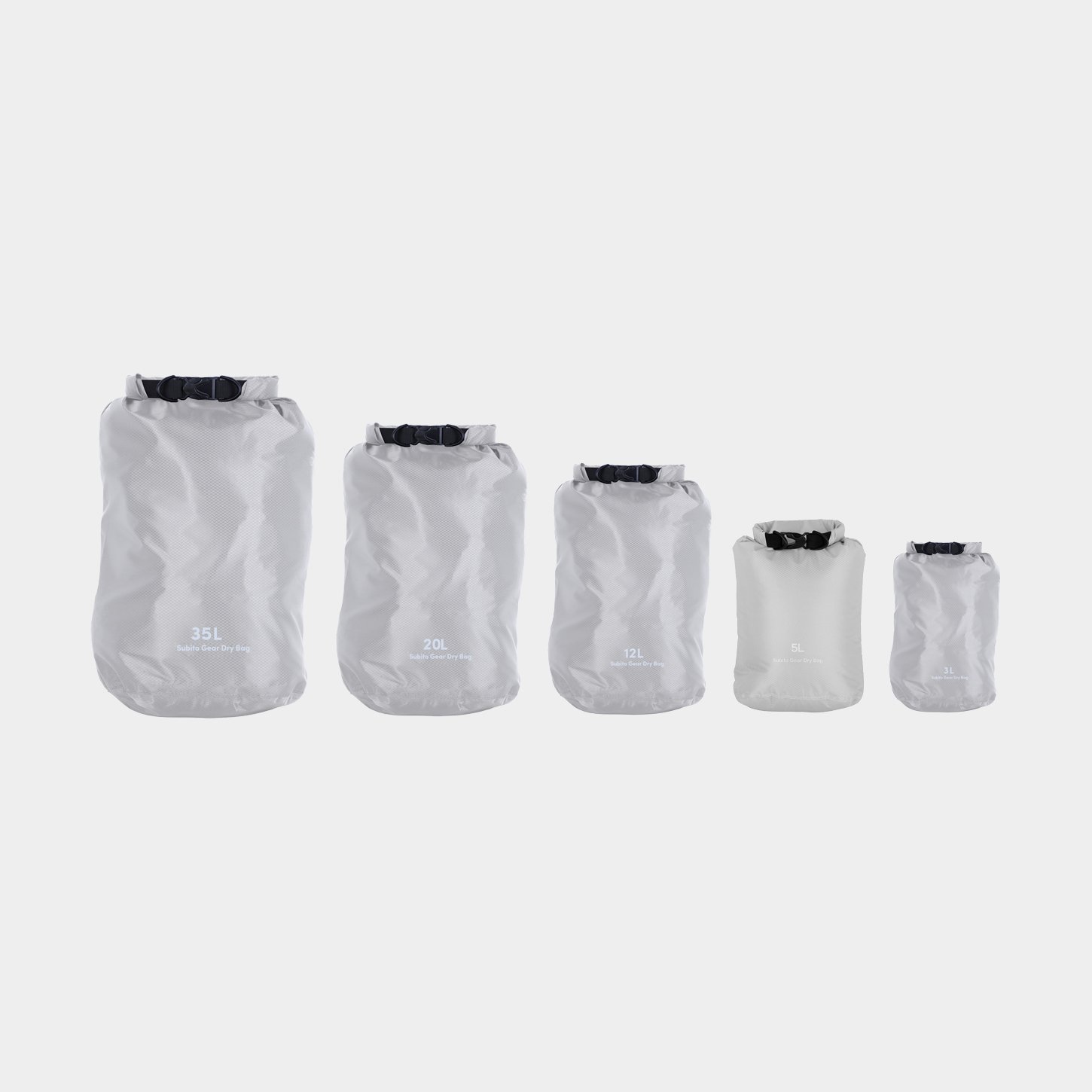 Drybag set / vattentäta packpåsar Subito Gear, 70D, 3/5/12/20/35 liter, grå, 5-pack