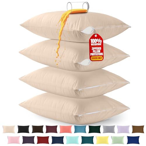 Utopia Bedding 4 Pack Waterproof Pillow Protectors with Zipper Standard Size (Beige), Bed Bug Proof Pillow case Covers, Moisture Wicking Pillow Encasements 20 x 26 Inches