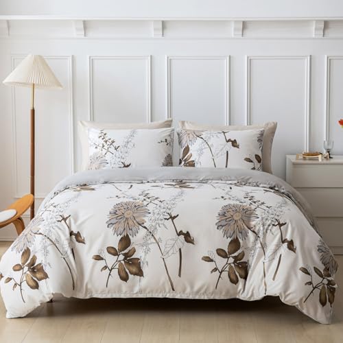 Appletree – grått blommigt påslakan – king size-sängkläder (230 x 220 cm) – mjuk 100% bomull satin – bandband – 2 örngott – vintage sängkläder med blommönster – botaniskt sängset
