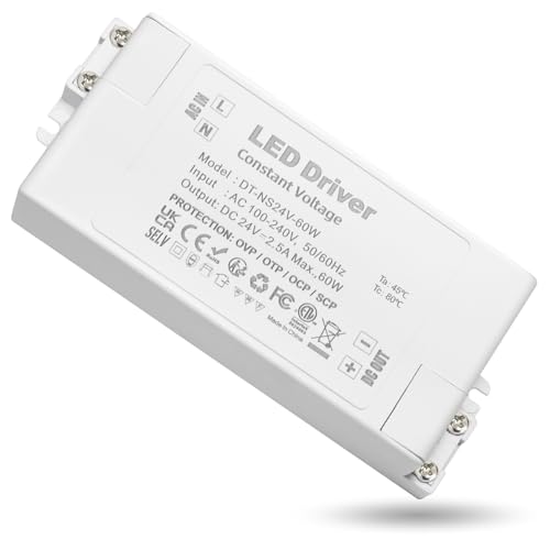 REYLAX LED-transformator 24 V, transformator 230 V till 24 V 60 W 2,5 A, konstant spänning LED-strömförsörjning 24 V, LED-drivrutin transformator, lågspänningstransformator för LED-remsor, ersätter