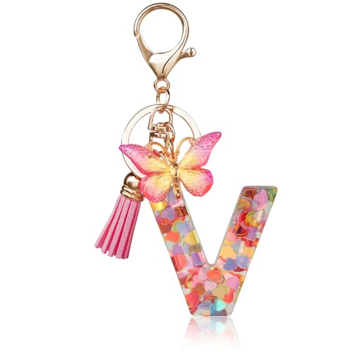 OSDUE Nyckelring med initialer för flickor och kvinnor, hartsbokstäver nyckelring, med fjäril och tofs hänge, för kvinnor, flickor, plånböcker, handväska, berlock, V, V