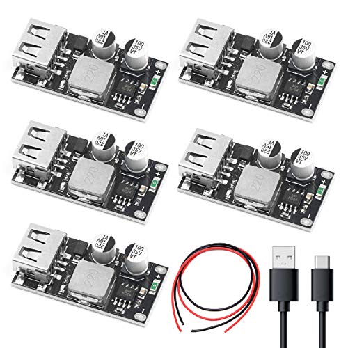 Youmile 5 st DC-DC USB Buck Converter Step-Down-modul 6-32 V 12 V 24 V till 5 V QC 3.0 laddningsmodul spänningsregulator strömförsörjningsmodul med 24 AWG tråd, USB typ C-kabel