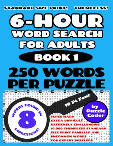6-Hour Word Search for Adults Book 1: 250 Words per Puzzle - Super Hard, Extra Difficult, Extremely Challenging 10,000 Themeless Standard Size Print Familiar and Uncommon Words For Expert Puzzlers