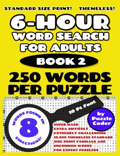 6-Hour Word Search for Adults Book 2: 250 Words per Puzzle - Super Hard, Extra Difficult, Extremely Challenging 10,000 Themeless Standard Size Print Familiar and Uncommon Words For Expert Puzzlers