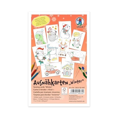 Ursus 28330099F – sykort för barn, vinter, ca 11 x 17 cm, för broderi och färgning av 10 vita motivkort, tillverkad av pysselkartong 250 g/m²