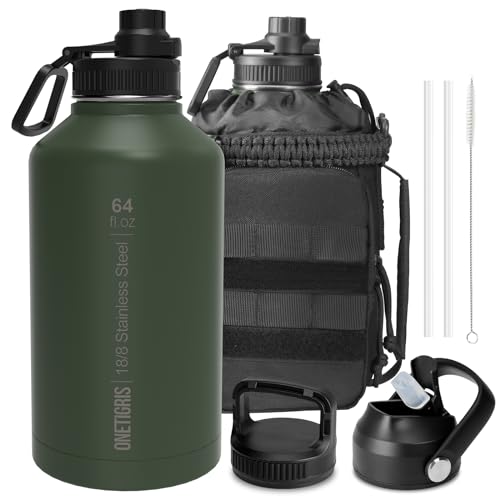 OneTigris Vattenflaska i rostfritt stål, 2L vattenflaska med hög kapacitet, sportflaska med bra isolerande effekt för cykel, camping, yoga, gym, airsoft, OD-grön, 64OZ