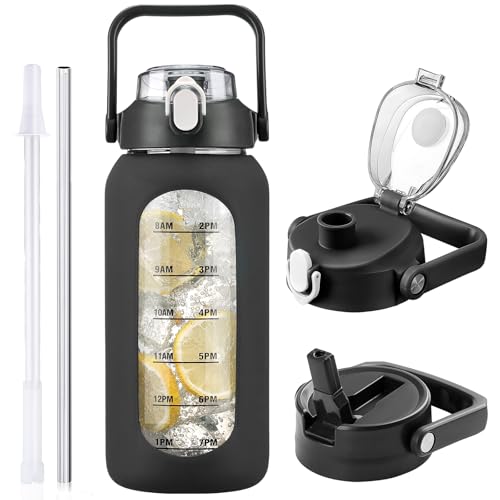 HYDRAGLAZIC 2L vattenflaska i glas med sugrör och 2 lock, glasvattenflaska med tidstryckt silikonhylsa, sportkopp med bred mun, svart