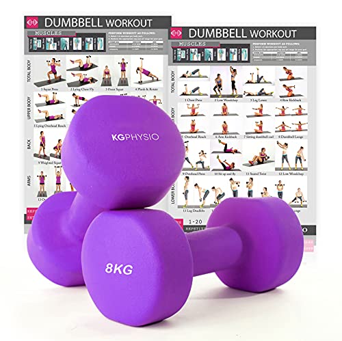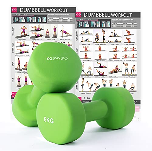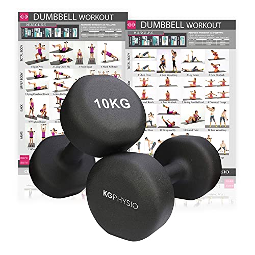 KG Physio hantelset med A3-övningsaffisch - neoprenhantlar set med 2 - fitnessvikter av gjutjärn - vikter hantelset, svettabsorberande hantelset för kvinnor och män - hantlar 1 kg - 10 kg
