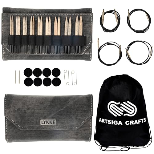 Lykke Knitting Needles Cirkulärt utbytbart set drivved 3,5 tum långt (9 cm) grått denimpaket med Artsiga hantverk projektväska