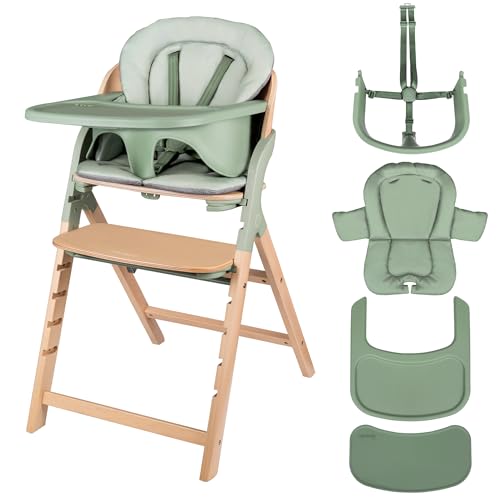 LIONELO Megan 3-i-1 Växande Barnmatstol i Trä (Baby från 6 Mån till Vuxna upp till 110 kg), Hög Stol med Justerbar Höjd & Fotstöd, Avtagbar Bricka med Silikonöverdrag, 5-Punktsbälte, Grön