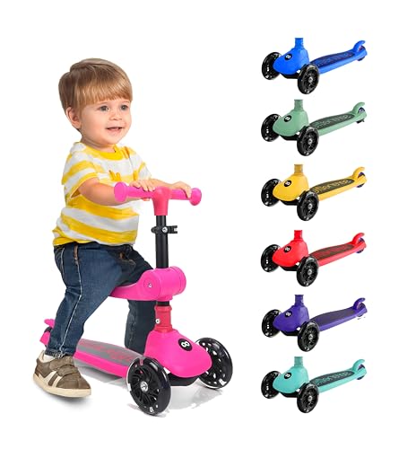SereneLife 3 Wheel Foldable Kids Scooter - Foldable Seat, LED Wheel Lights, Adjustable Handlebar, Rear Foot Brake, Lean-to-Steer, Anti-Slip Deck, Ideal for Toddlers Kids 3+, up to 110Lbs (Pink)