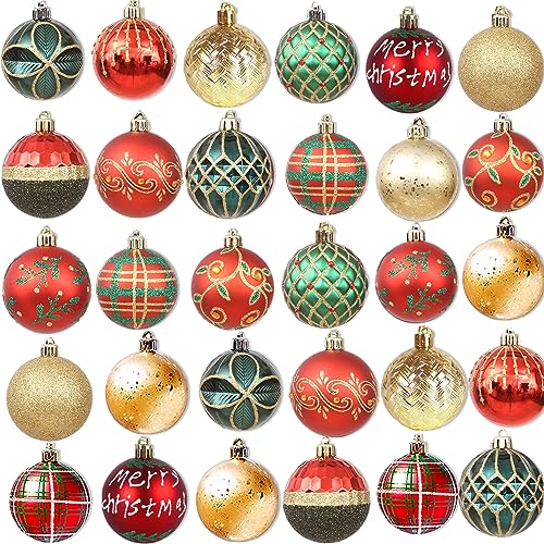 Julgranskulor, julgransprydnadsset, 30 stycken kulor av plast, i låda, med hängare, för dekoration av julgranen till jul, bröllop eller fest (röda, gröna och guldfärgade)