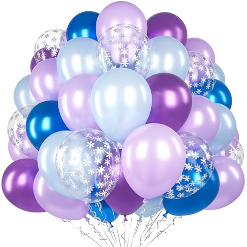 Frozen Ballong, 60 stycken 30 cm (12 tum), metallisk blå, lila, latexballong, set med 2 band och snöflinga, konfettiballonger för flickor, prinsessa, födelsedag, frost, tema, fest, dekoration, baby