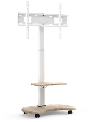 FITUEYES Vit TV-stativ på hjul med 20 mm träbas för 32-70 tums TV, mobil TV-vagn med 60° vridbar och 6 höjd justerbar, max. VESA 600 x 400 mm rymmer 40 kg