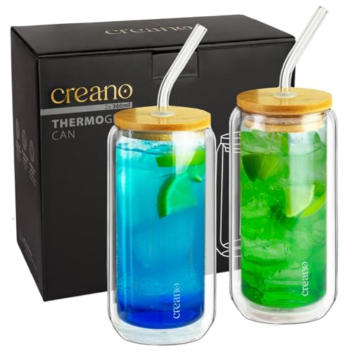 Creano dubbelväggiga dricksglas med bambulock och sugrör 360 ml – Smoothie-mugg – Bubble Tea – cocktailglas – set om 2