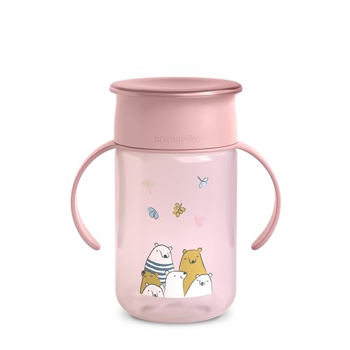 Suavinex, Baby lärande mugg, 360 tumlare med anti-spill och droppsystem, Magic Cup med handtag och lock, lämplig för diskmaskin och mikrovågsugn, 340 ml, träningskopp för spädbarn +12 månader, rosa