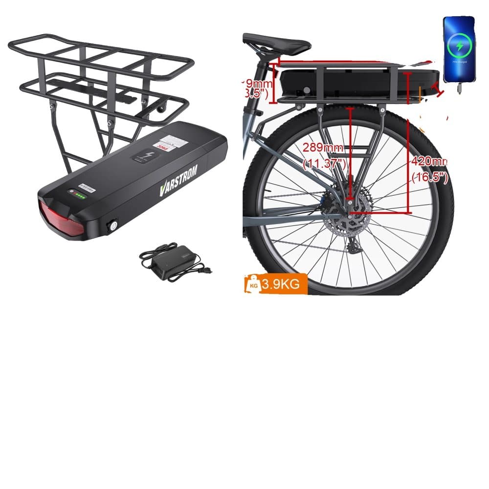 Varstrom 36 V 20,8 Ah bagagehållarbatteri med laddare och USB-port, litium36 V e-cykelbatteri, pakethållarbatteri för 250 W 500 W 750 W 1 000 W 1 500 W 2 000 W e-cykel konverteringssats