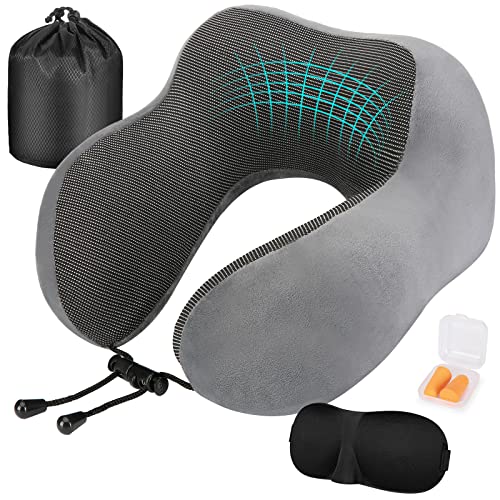 Eono Resekudde i Minnesskum, Nackkudde Flygplan med 3D-Glasögon, Öronproppar och Förvaringspåse,Bekväm Ergonomisk Resekudde för Flygplan, Bilar, Tåg och Kontor