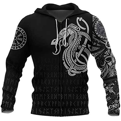 Viking Men Hoodie, 3D-Print Nordisk Mytologi Keltisk Drake Tatuering Grafik, Casual Atletisk Lös Passform Pullover,Zip hoodie,XXL