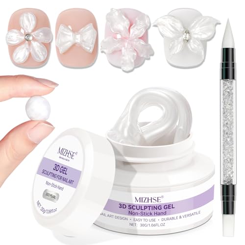 MIZHSE Pärla Vit 3D-skulptur Nagelgel, 3D Gel Nagelkonst för Modellering, Pärlvit Skulptur Nagellim icke Pinne Hand, Strass-lim för Nagelkonst Med Silikonnagelborste, 30G 1PC