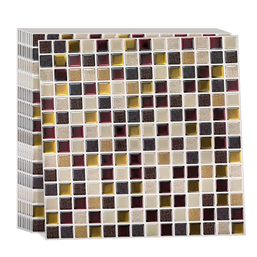 Alwayspon 10 ark 30 cm x 30 cm vinröd gyllene mosaik 3D vinyl väggkakelklistermärke överföringar, skala av och klistra fast självhäftande vattentät stänkskydd självhäftande kakel dekaler för kök