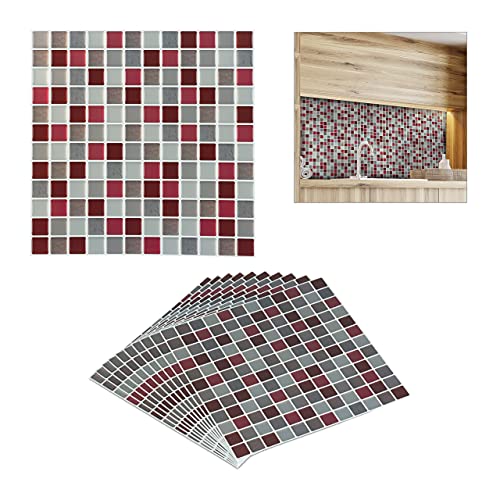 Relaxdays Mosaik kakeldekaler, set om 10, självhäftande, kök och badrum, 23,5 x 23,5 cm, 3D självhäftande plattor, röd/brun