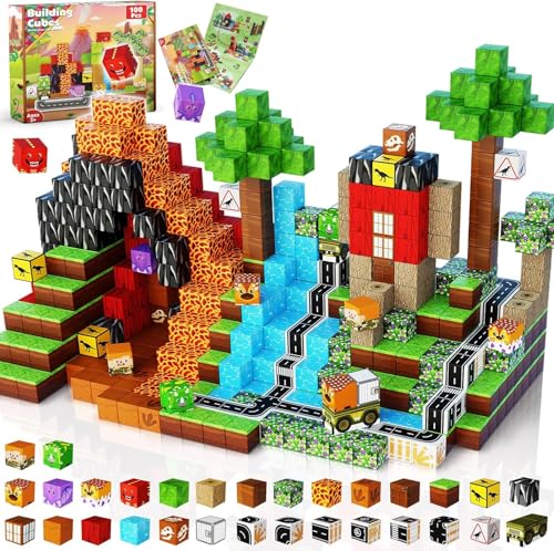 Magnetiska byggklossar 100 stycken magnetiska byggstenar set – kreativ 3D-leksak med dinosaurier, vulkan och naturlandskap | STEM Byggspel Från 3 År | Perfekt påskpresent till barn