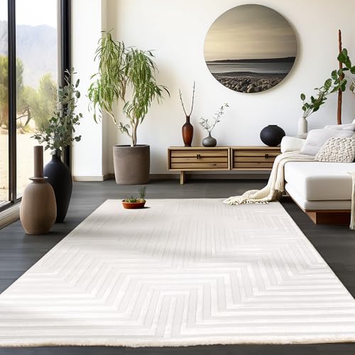 HomebyHome Vardagsrumsmatta med kort lugg, gräddvit, 3D-matta, skandinavisk stil, modern matta, 140 x 200 cm, tvättbar matta för sovrum, köksmatta, geometrisk design, mjuk vardagsrumsmatta