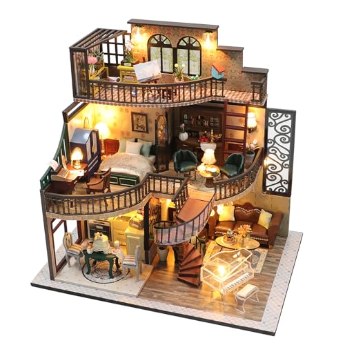 HIGSPE DIY Miniatyrhuskit, 3D-pussel med möbler och LED-ljus, dockhus i trä, vind, kreativitetsmodellbyggnad för barn och vuxna