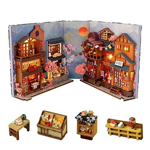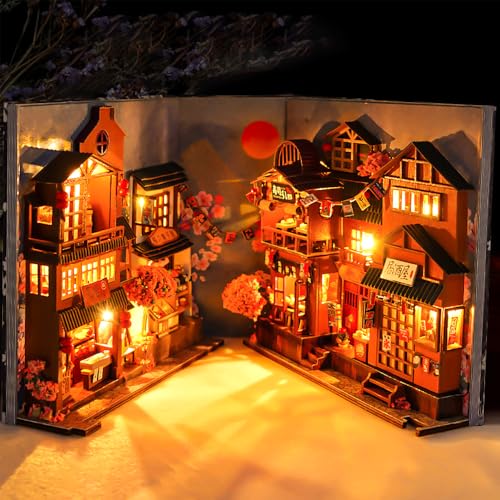 YANGUN Gör-det-själv bok Nook kit, 3D-pussel, trä, bokstöd, LED-lampor och möbler, miniatyrhus med dockhus, modellbyggsatser för vuxna för byggnad