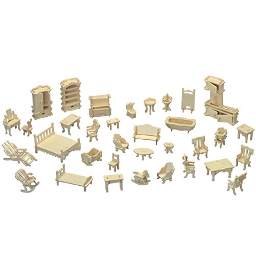 CUTEROOM Trädockhus - 3D-laserskuret miniatyrbyggsats (184 delar, 34 möbler) - Miniatyrmöbler