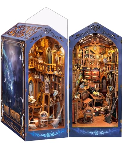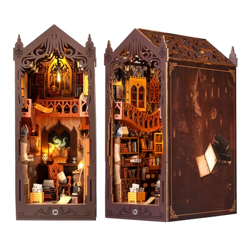 YANGUN Gör-det-själv bok Nook Kit, 3D-pussel, trä, bokstöd, gör-det-själv miniatyrhus med sensorljus och möbler, dockhus, miniatyr, huskit, modellbyggsatser för vuxna för byggnad (magiskt bibliotek)