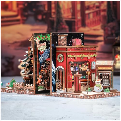 Cutefun Book Nook Kit, Diy Miniatyr Dockhus Trä Bokstöd Bokhylla Med LED-ljus 3D Trä Pussel Hantverk Hem Deco för Tonåringar Och Vuxna (Christmas Cabin)