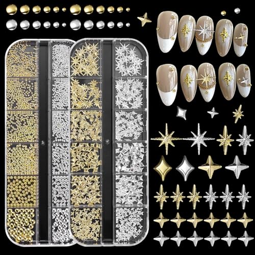 Yamobi 2 lådor guld silver stjärna nagelberlocker, 3D-legering stjärna måne nagel strass, femuddig stjärna glitter nagelkonst design, nagel ädelstenar